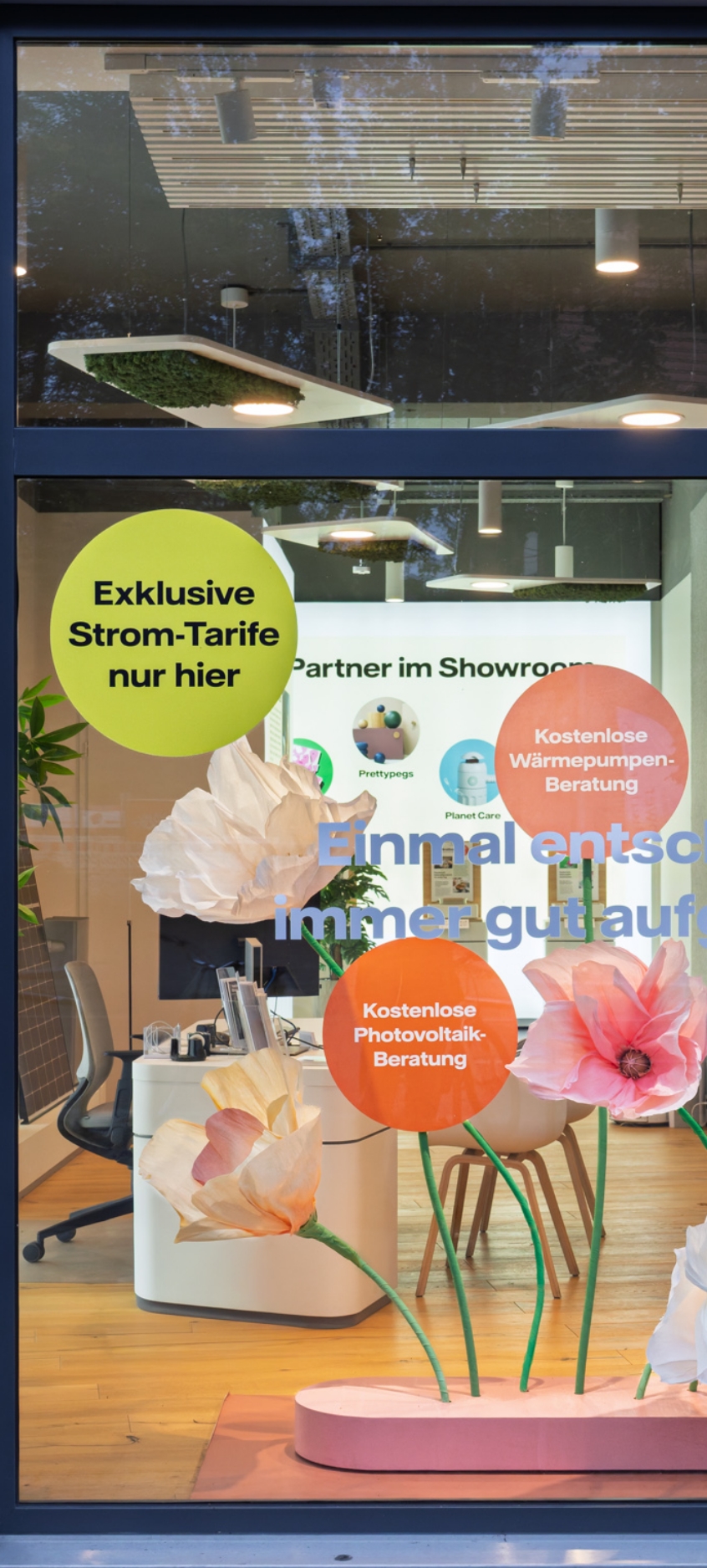For Vattenfall's 2025 summer campaign, we created a brand experience that conveys a feeling of lightness. The central motif of the campaign is an eye-catching floral installation that emphasizes how easy it is to find electricity solutions when you have Vattenfall as your partner. This concept was implemented in all shops and showrooms across Germany and offered a uniform overall package consisting of key visuals, motion design and shop window installations.